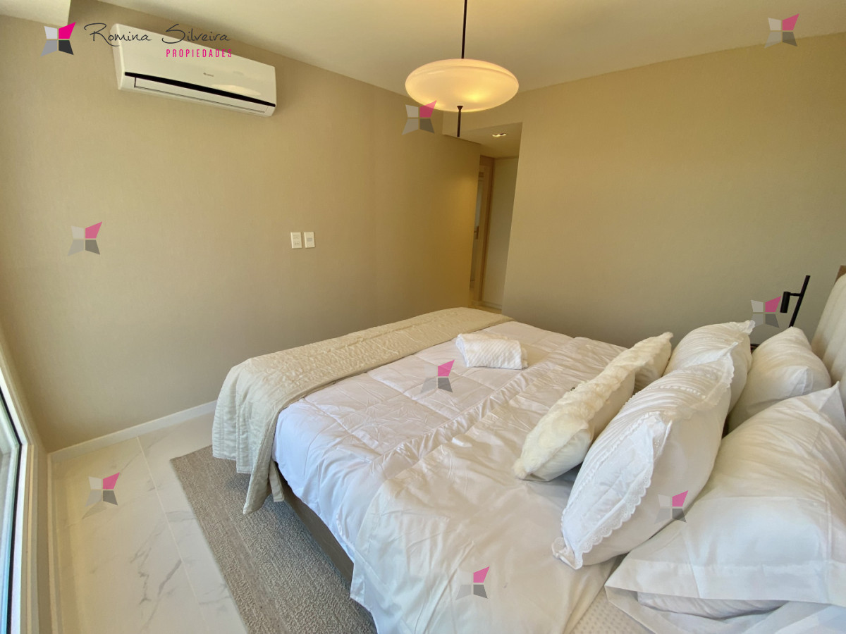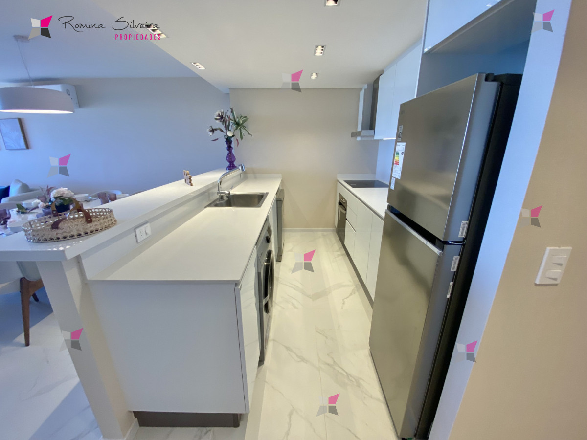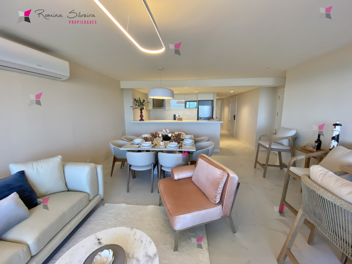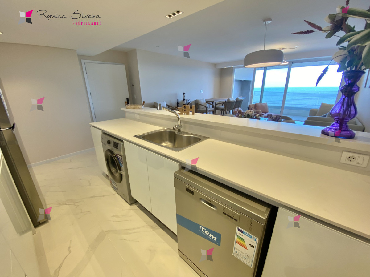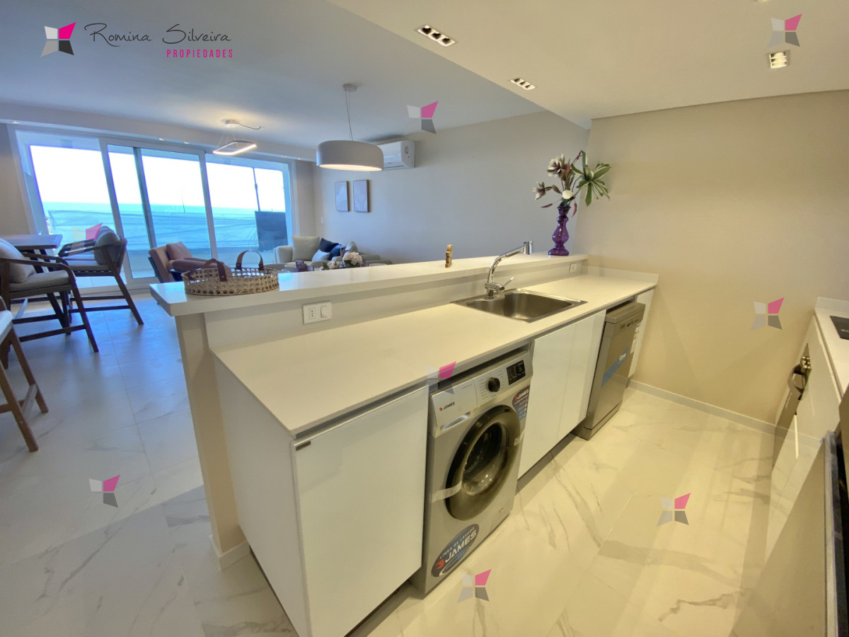 El apartamento cuenta con living comedor y cocina integrada, con salida a amplia terraza con parrillero. Desde el balcón se disfrutan vistas abiertas al mar y a la laguna.