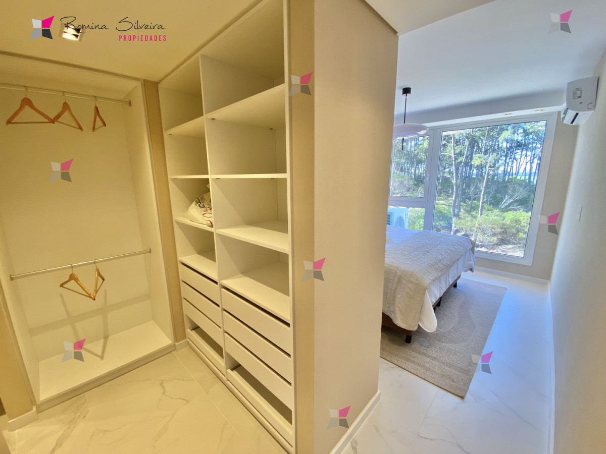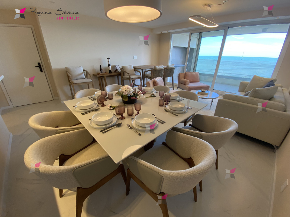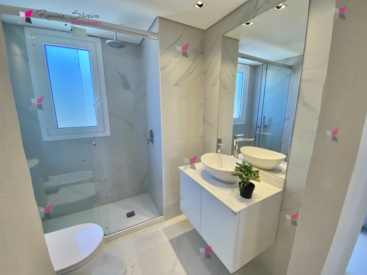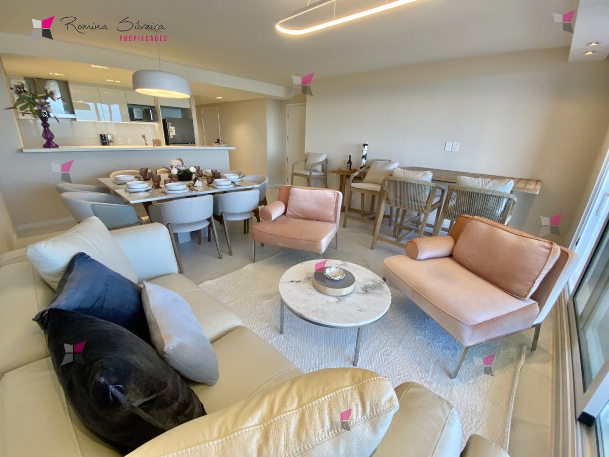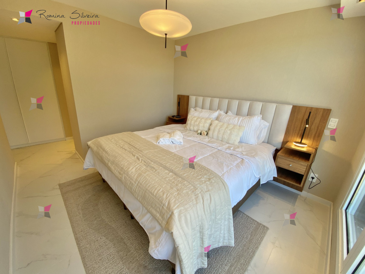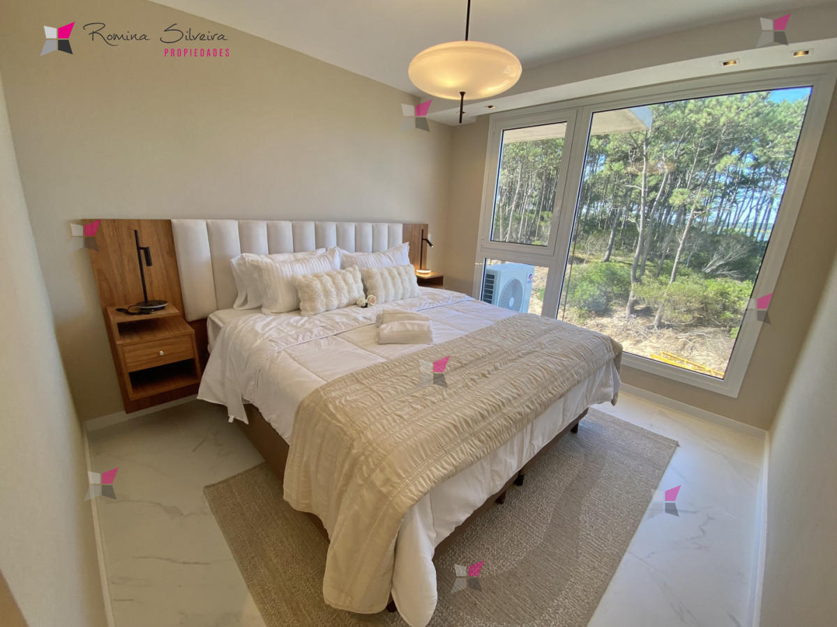 El apartamento cuenta con living comedor y cocina integrada, con salida a amplia terraza con parrillero. Desde el balcón se disfrutan vistas abiertas al mar y a la laguna.