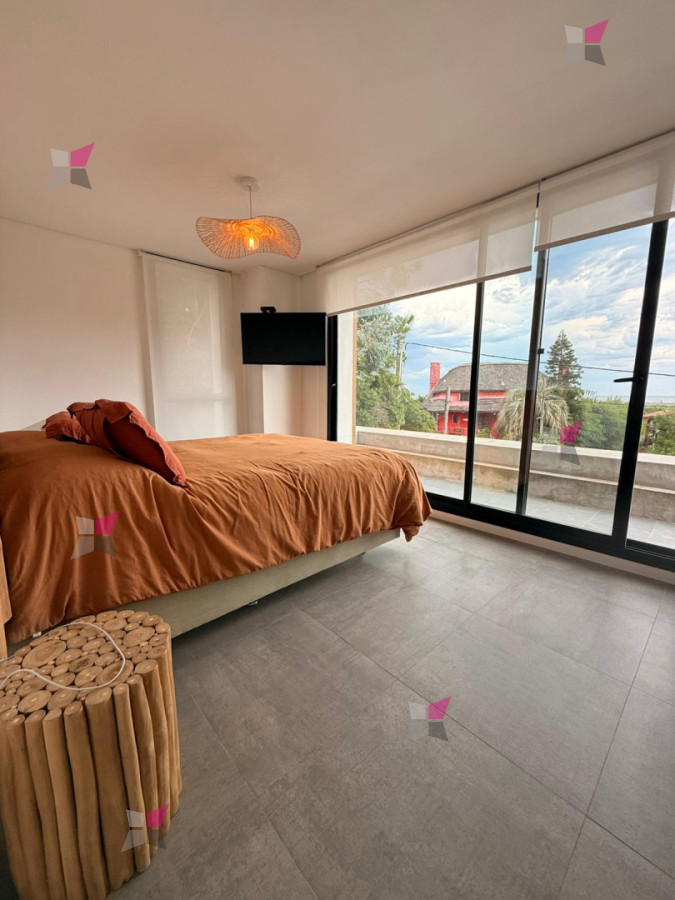 En la planta alta, la casa dispone de tres dormitorios y dos baños, uno de ellos en suite. El dormitorio principal cuenta con terraza privada y vista parcial al mar.
