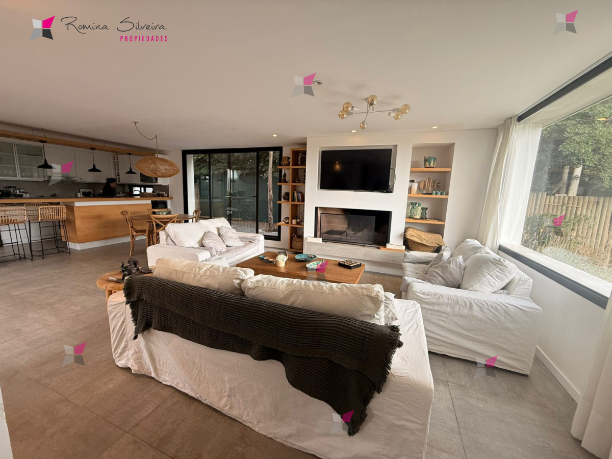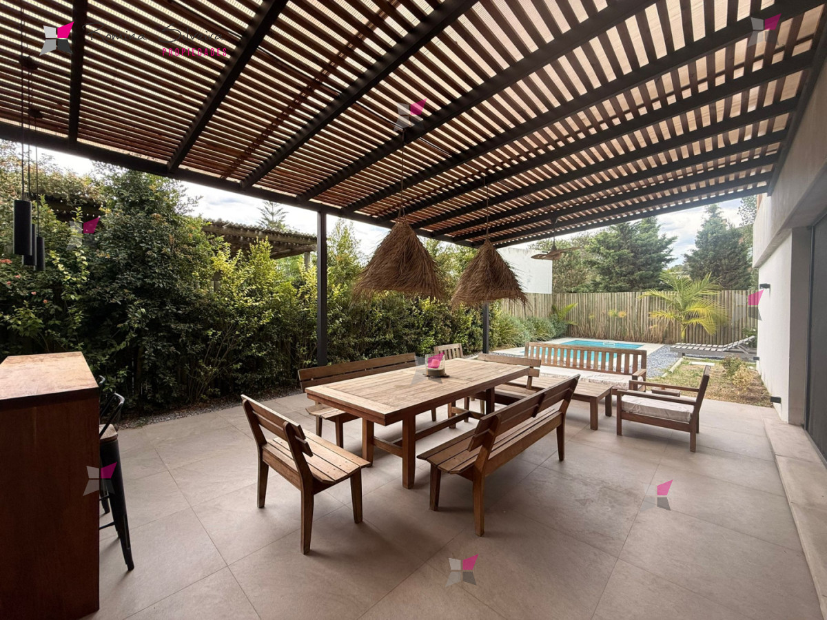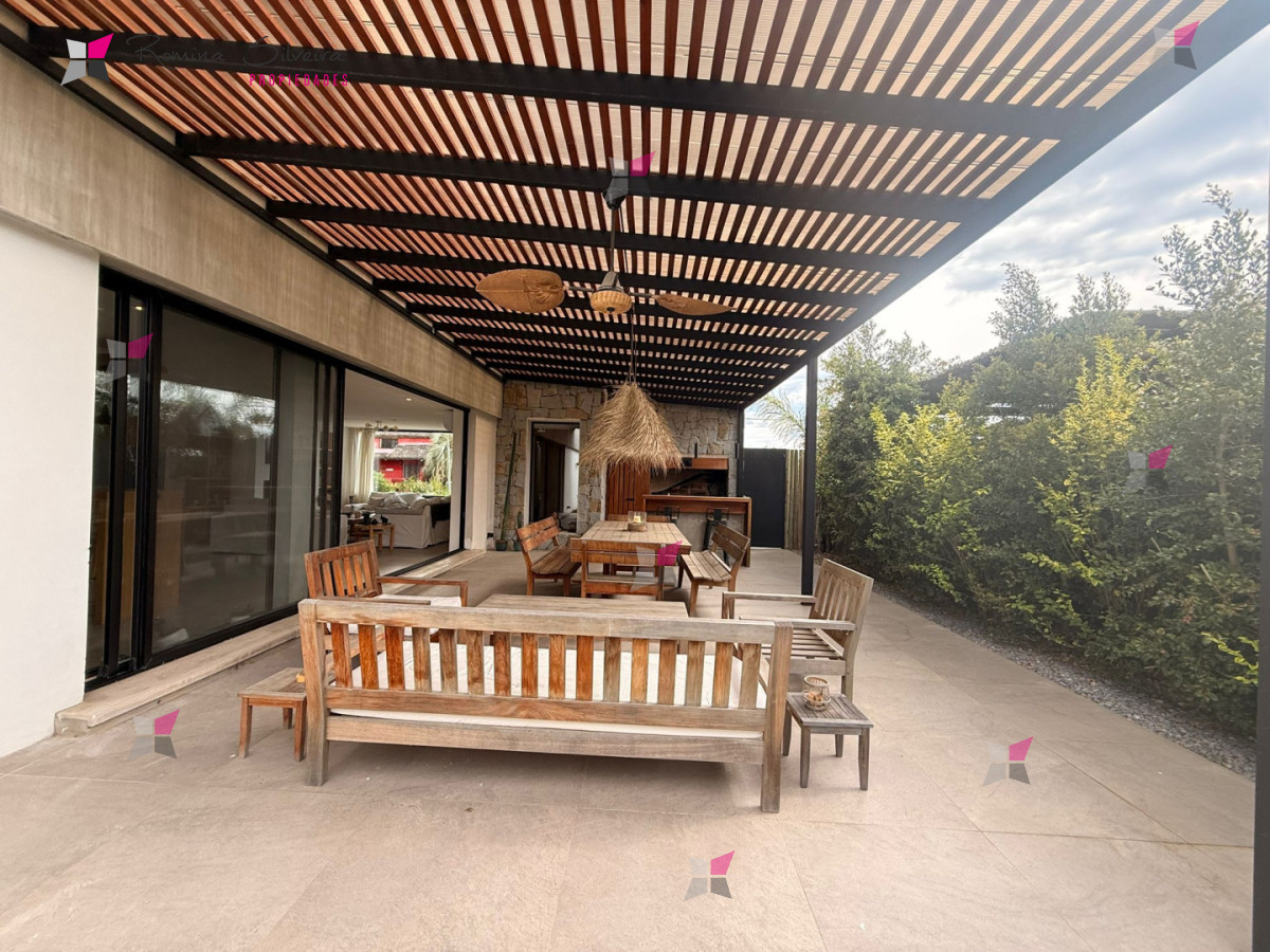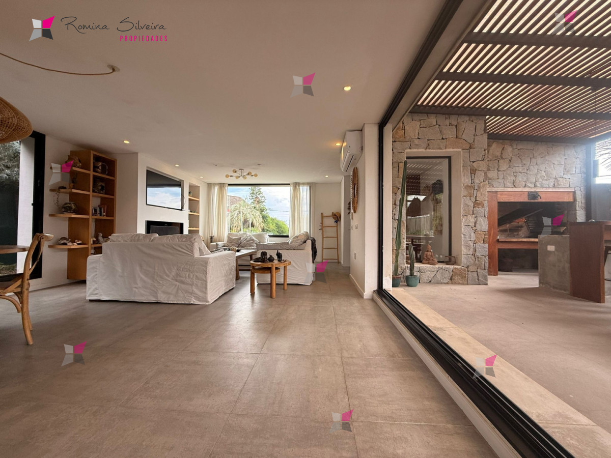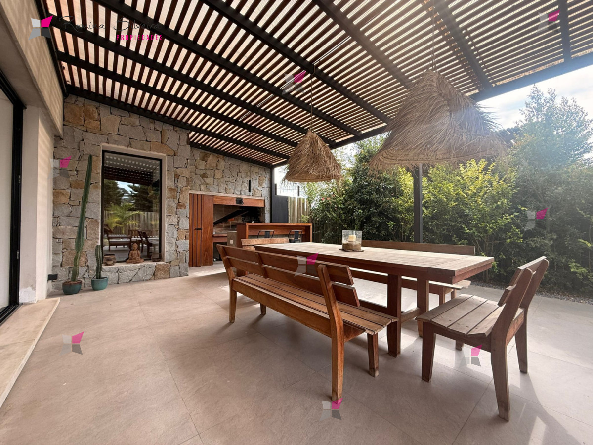 Casa en Manantiales, ubicada a 570 metros del mar, desarrollada en dos plantas y de estilo moderno contemporáneo, con una marcada impronta cálida y natural a través del uso de madera, piedra y tonos neutros.